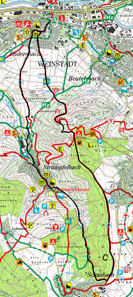 Die Ortsgruppe des Schwäbischen Albvereins Bad Urach bietet am Sonntag den 9. September 2018 eine Tageswanderung von Endersbach über Strümpfelbach auf den Schurwald an. Die abwechslungsreiche Rundwanderung mit vielen schönen Ausblicken in das Remstal geht durch Streuobstwiesen und Weinberge zunächst nach Strümpfelbach. Dort gibt es durch den ganzen Ort viele schöne Fachwerkhäuser und sehenswerte Skulpturen von Professor Nuss zu sehen. Ab dem Ortsausgang geht es am Strümpfelbach entlang durch Wälder hoch auf die Höhen des Schurwaldes, vorbei am Karlstein wieder zurück nach Endersbach.