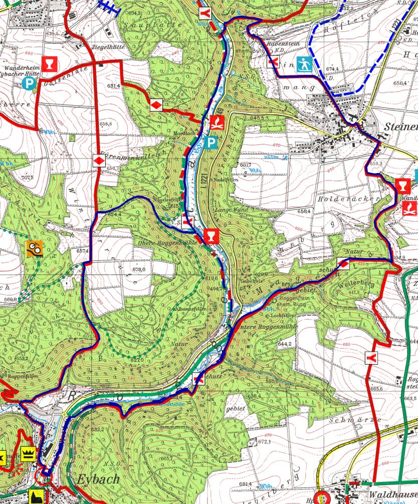 Für den Rückweg werden zwei Varianten angeboten. Entweder geht man über einen etwas sportlicheren Anstieg oder direkt talabwärts zurück nach Eybach. Es besteht auch die Möglichkeit einer Abholung direkt von der Roggenmühle.